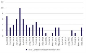 The ship demolition market remained subdued toward the end of the year, with no significant transactions reported specifically for containerships. International ship recycling market analyses indicate that owners showed limited willingness to send containerships for scrapping, reflecting a cautious approach to asset disposal.