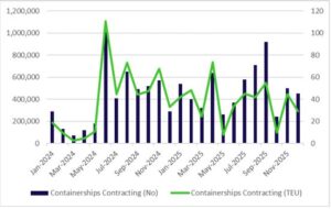 During December, the containership freight market was strongly influenced by external factors and geopolitical developments, which shaped an unstable operating environment. References to a potential return of vessels to the Red Sea raised concerns within the market, as such a development is associated with an increase in available capacity and possible pressure on freight rates.