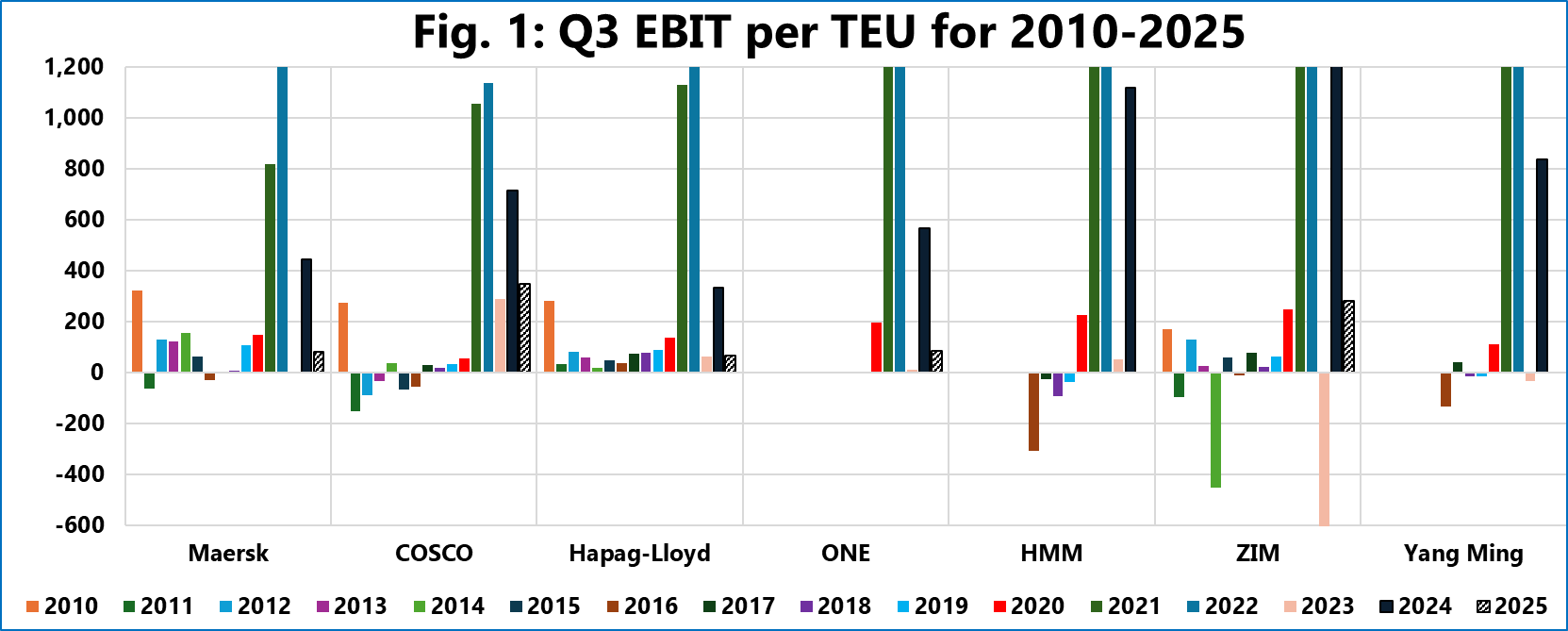The remaining major carriers – ONE (85 USD/TEU), Maersk (83 USD/TEU), and Hapag-Lloyd (65 USD/TEU) – saw their margins compress significantly, dropping below the 100 USD/TEU mark. This stands in sharp contrast to the same period last year, where the lowest EBIT/TEU in this group was 335 USD/TEU, highlighting the extent of the post-peak market correction.