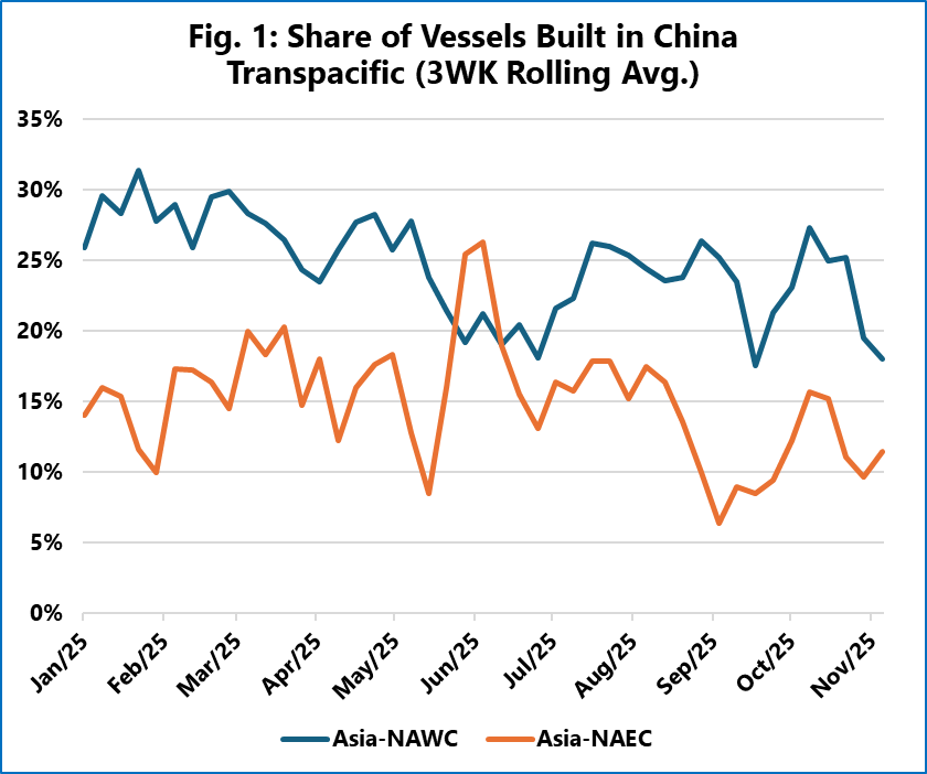 On the Transpacific, there are early signs of a reduction in the deployment of Chinese-built vessels. As shown in Figure 1, for the Asia-North America West Coast trade, the share of Chinese-built vessels has trended downwards from a level of 25-30% in the first half of 2025 to a range of 20-25% in recent weeks. A similar, though less pronounced, trend is visible on the Asia-North America East Coast trade.