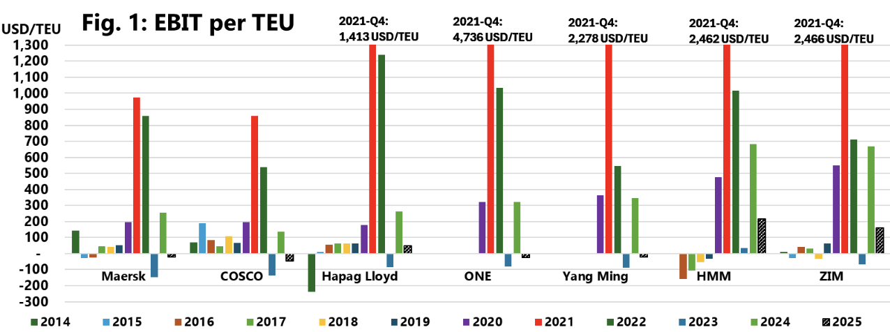 In issue 759 of the Sunday Spotlight, Sea‑Intelligence analysed the 2025‑Q4 financial and operational performance of the major global container shipping lines. The reporting shipping lines recorded a combined EBIT of USD 392M in 2025‑Q4, representing a staggering collapse from the USD 7.60bn combined operating profit recorded in 2024‑Q4. This signalled not only a return to severe pre‑pandemic margin pressures but also wiped out the recovery momentum that was built throughout 2024.