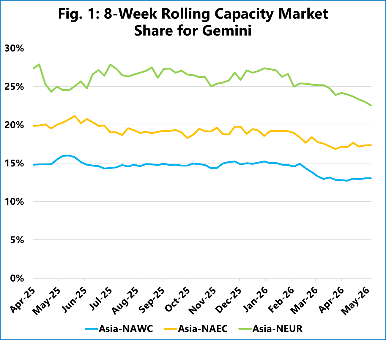 The rolling 8‑week average weekly capacity market share, as shown in Figure 1, demonstrates a clear downward trajectory for Gemini. Between April 2025 and May 2026, Gemini’s share of Asia‑North America West Coast weekly deployed capacity is projected to contract from 15% to 13%. Concurrently, the Asia‑North America East Coast trade lane is seeing a reduction from 20% to 17%, and Asia‑North Europe is declining from 27% to 23%. On all three, the contraction almost exclusively happens within a narrow window from mid‑February and May 2026.