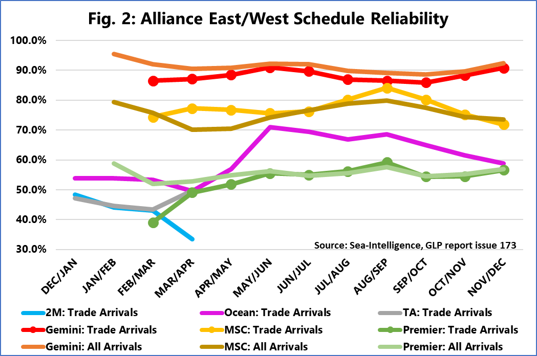 Traditionally, alliance scores are based on just the arrivals in destination regions, but as that metric was not available for the new alliances in February, Sea-Intelligence introduced a new measure, based on all arrivals, including the origin region calls on the East/West trades. Sea-Intelligence continues to present both measures, “All arrivals” which is comparable to the February measure, and “Trade arrivals”, which is comparable to the “old” alliances. When the new alliances are fully rolled out, these two measures will converge.