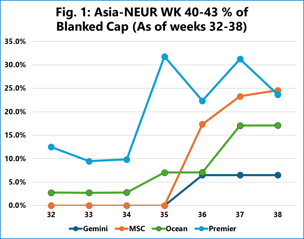 To track this development, they analysed the evolution of announced blank sailings for the four-week Golden Week period (weeks 40-43) on a weekly basis, capturing the data from week 32 through week 38. This allowed them to see, not only the total capacity withdrawn, but also the timing of the announcements by each alliance, revealing clear first-movers and latecomers.