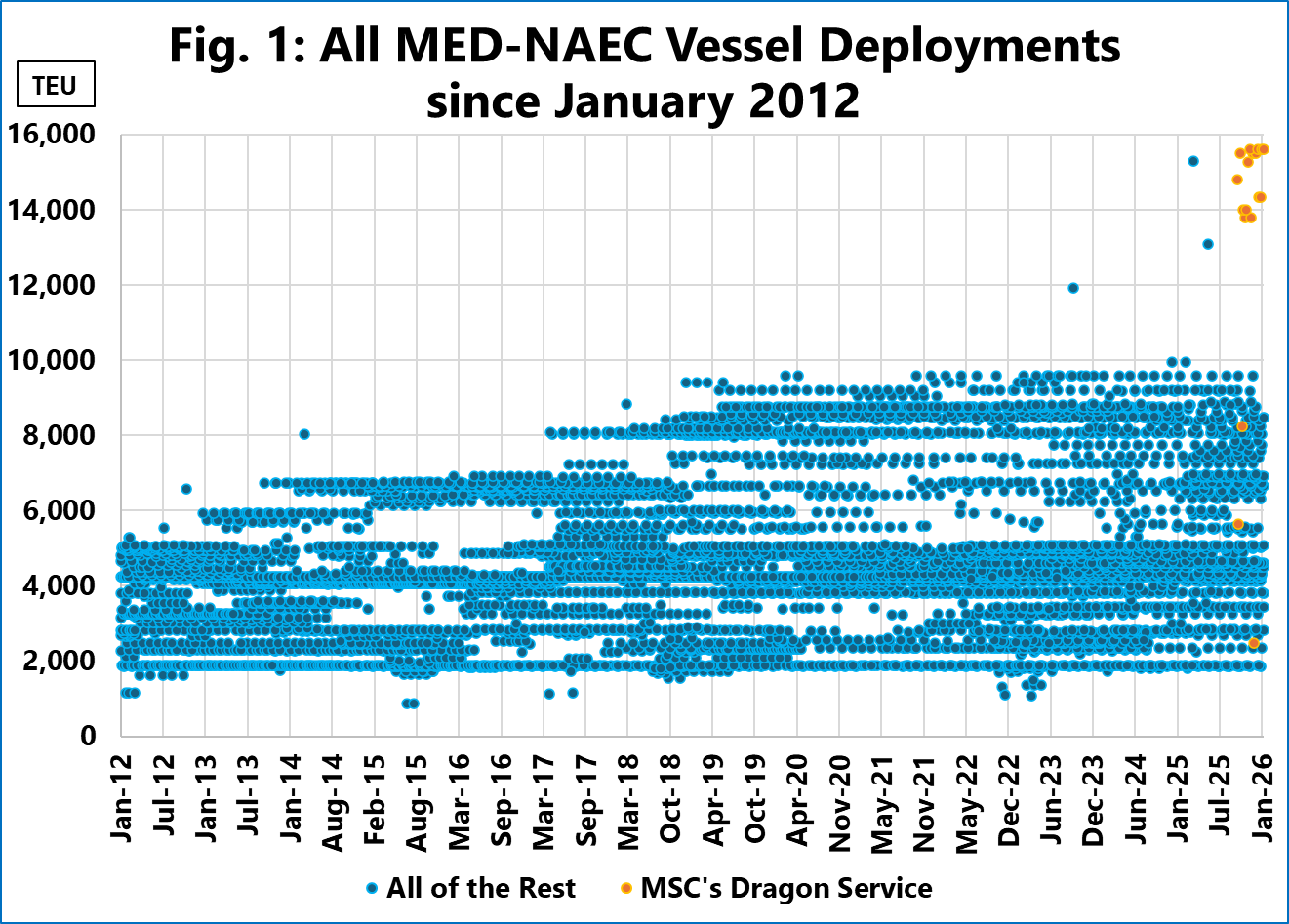 As shown in Figure 1, the market is defined by a dense primary cluster of vessels ranging from 800 TEU up to a clear historical ceiling of roughly 9,600 TEU. However, in 2025, a distinct second cluster emerges at the top right of the chart, consisting of vessels in the 13,000-15,000+ TEU range. Of those, 2 (in blue) were deployed by MSC on their EMUSA service. However, these serve as outliers as the service continues to deploy 8,000-9,000 TEU vessels.