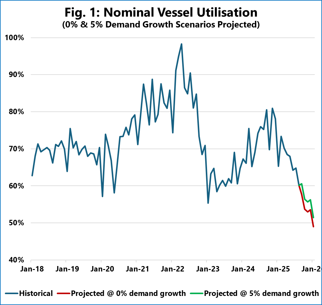 This is compounded by weakening demand, with demand growth turning negative Y/Y in September 2025. Despite this, current forward-looking schedules point to the shipping lines injecting substantial capacity into the trade, which will very likely have a destabilising impact.