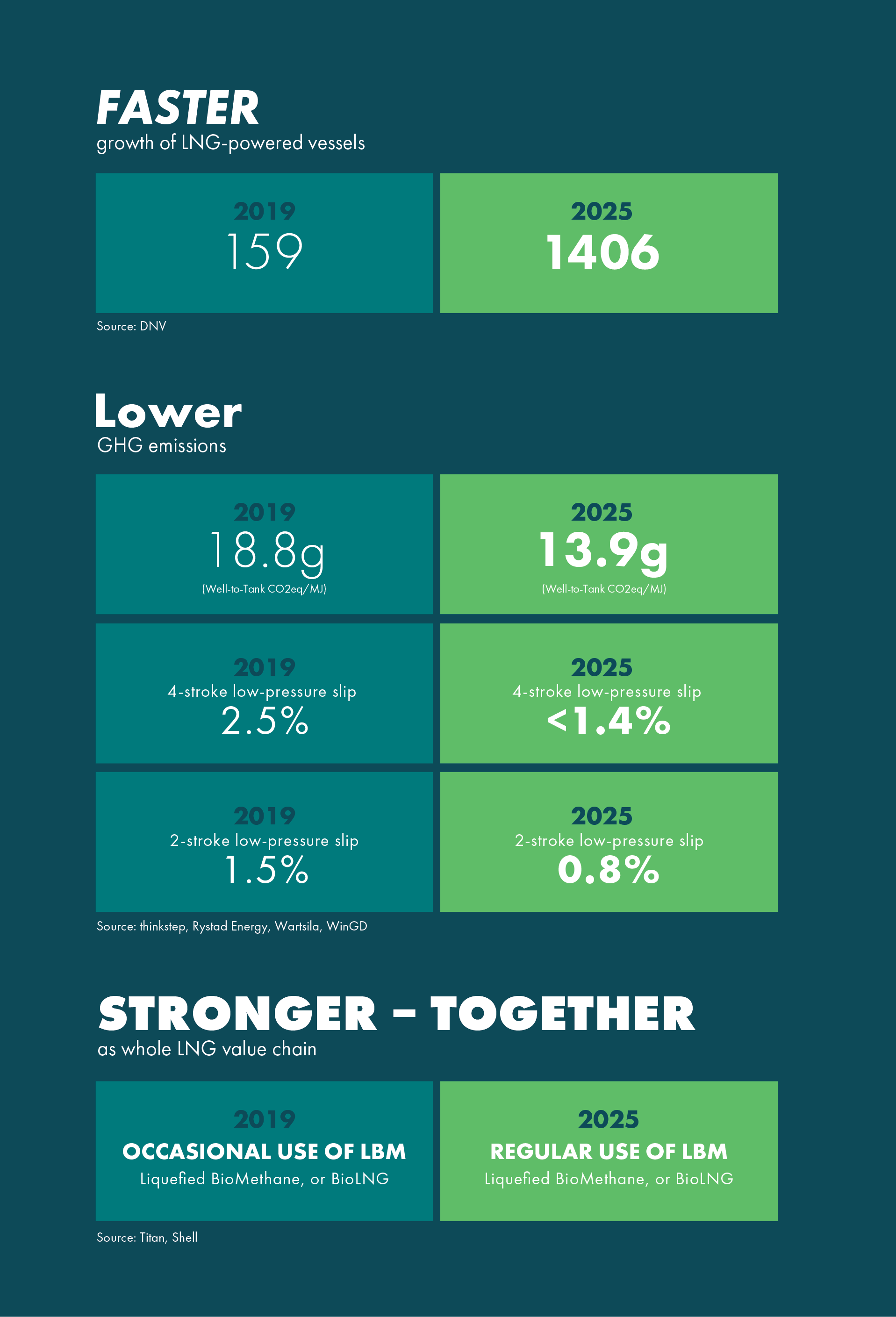 Over the past six years, SEA-LNG members have helped drive global adoption of LNG-fueled vessels while supporting wider use of liquefied biomethane (LBM). At the same time, energy producers have cut well-to-wake emissions by 25%, and engine manufacturers have nearly halved methane slip, marking steady progress toward further reductions.