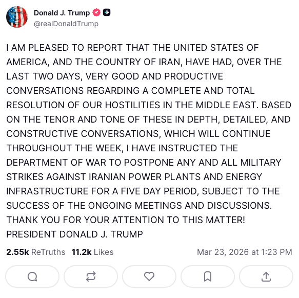 Trump wrote on Truth Social that the United States and Iran have engaged in discussions aimed at a “complete and total resolution” of hostilities in the Middle East. He instructed the Department of War to delay any attacks for five days, pending the outcome of ongoing talks.