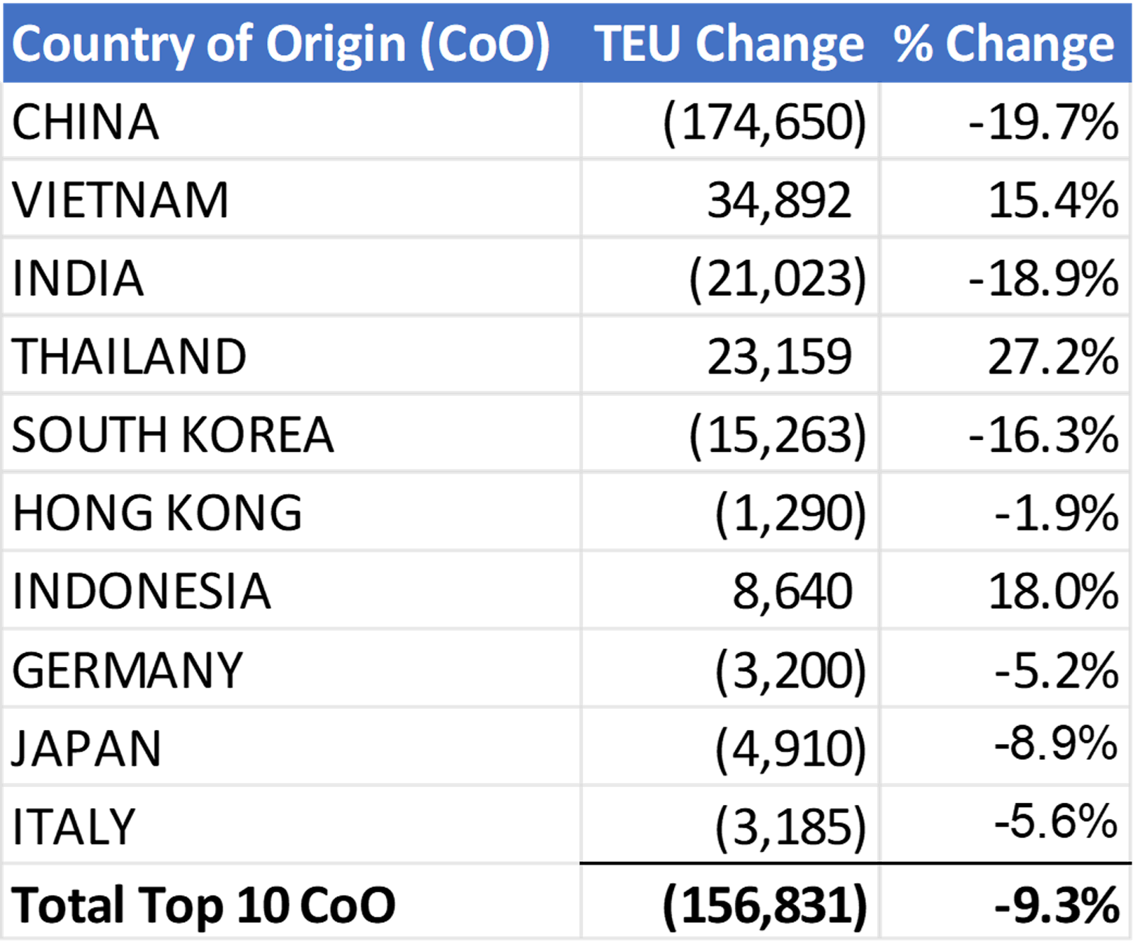 In contrast, Southeast Asia showed strong growth. U.S. imports from Vietnam increased 15.4%, while Thailand jumped 27.2% and Indonesia rose 18%. Still, the gains did not offset the sharp fall in China volumes.