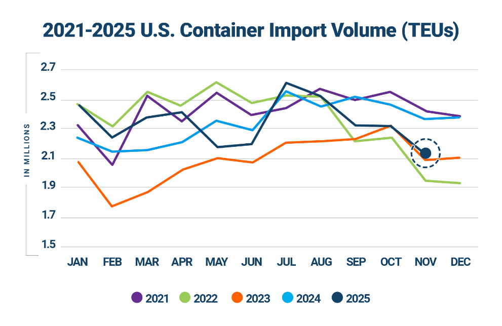 For the first eleven months of 2025, U.S. container imports were just 0.1% higher than last year. That compares with growth rates near 10% at the start of the year. The narrowing gap points to cooling demand and the fading impact of early-year frontloading.